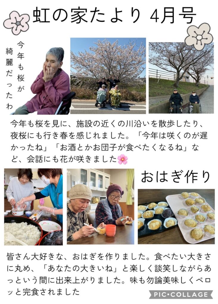 虹の家たより4月号を発行しました。今年も天気の良い日に施設近くの川沿いを散歩したり、夜桜も見に行きました。春の陽気も感じ「綺麗やね〜」「来年も見るのが楽しみ」と会話に花が咲きました。おはぎ作りも行い、皆さんペロリと完食されました。