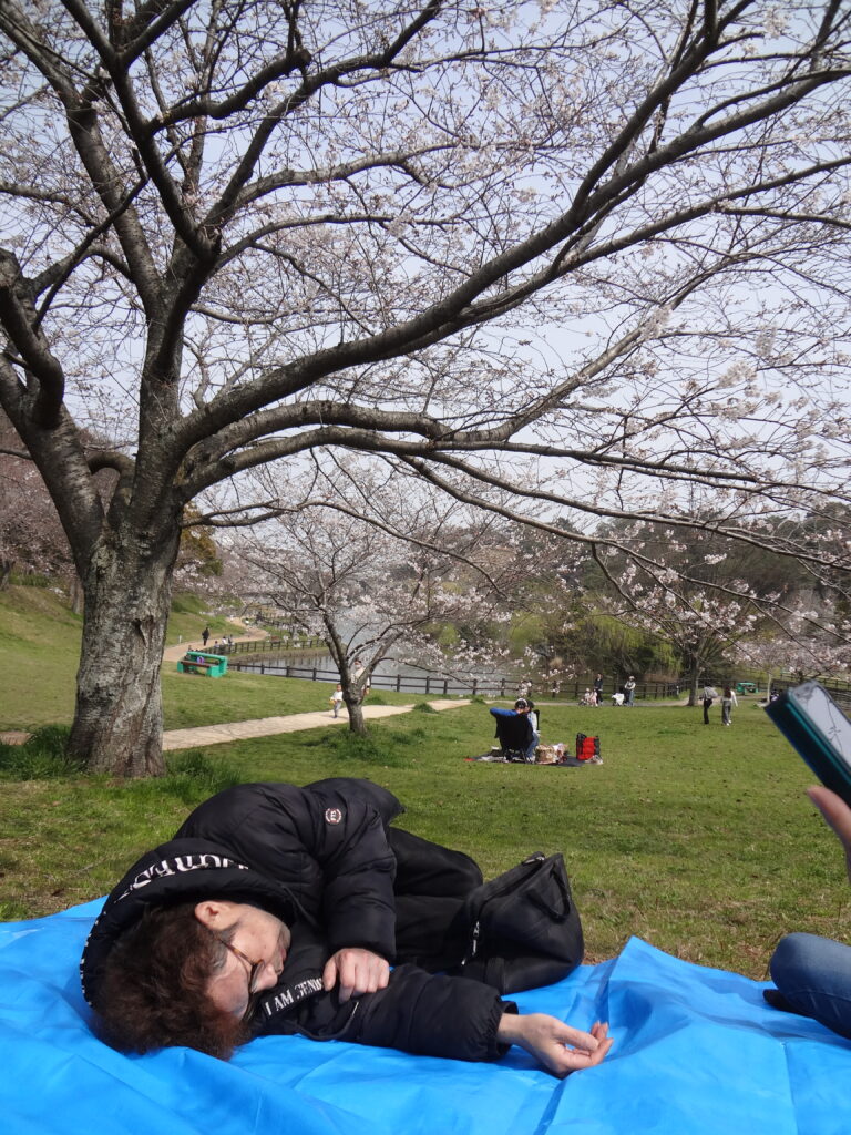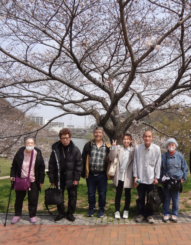 お昼はレジャーシートを引き、桜の木の下でスタッフと利用者みんなで食べました。「花見客多いね」「やっぱりから揚げ弁当が一番やね」と感想を言い合いながらゆっくり過ごすことが出来ました。