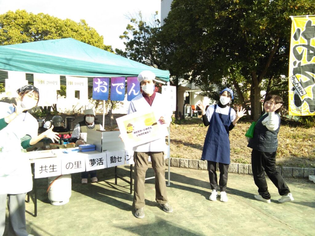 福祉ブースでは6つの事業所が出店し、おでんや唐揚げ、スイーツ等の販売、ゲームコーナーを通じて地域のお客様との触れ合いを楽しみました。また、会場でお寄せいただいた「赤い羽根共同募金」の12,166円は、下関市社会福祉協議会を通じて山口県共同募金会へ全額寄付し、地域の福祉活動へと繋げさせていただきます。