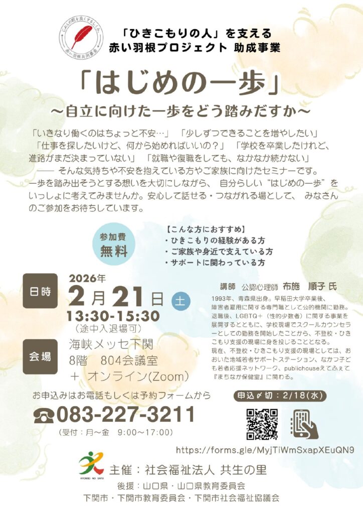 令和8年2月21日(土)には、ひきこもりの経験がある方、ご家族や身近で支えている方、サポートに関わっている方等に向けて、「はじめての一歩」~自立に向けた一歩をどう踏みだすか~をテーマに、一歩を踏みだそうとする思いを大切にしながら、自分らしい”一歩”をいっしょに考え、安心して話せる・つながれる場の開催を企画しています。