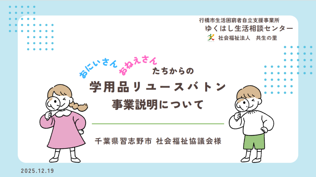 このたび、千葉県習志野市社会福祉協議会様に学用品リユースバトンの事業説明をさせていただきました。