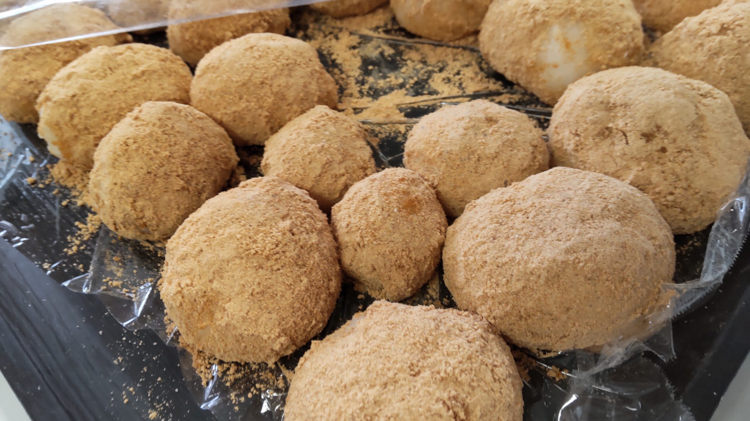 できたてのお餅をメンバーさんが丸めてきな粉をまぶしたり、おはぎにしたり、